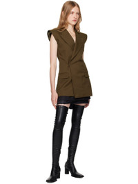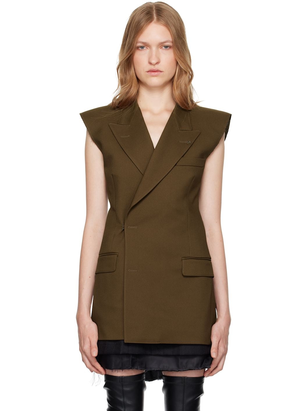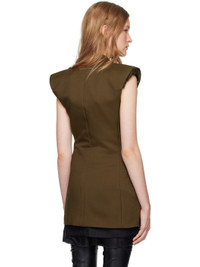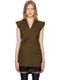 Polyester twill vest. · Peaked lapel · Double-breasted hook-eye closure · Welt pocket and darts at chest · Flap pockets at front · Padded shoulders · Raw edge at armscyes · White stitching at back collar · Full satin lining Supplier color: Khaki Body: 100% polyester. Lining: 100% viscose. Made in Italy 242188F068003