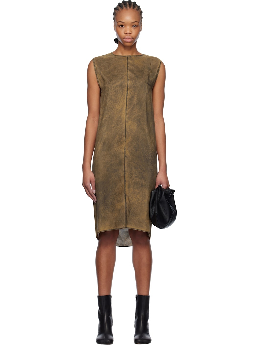 Silk satin midi dress. Fading throughout. · Crewneck · Central seam at front · Self-tie strap at back collar · Draping and white stitching at low back · Unlined Supplier color: Rust black 100% silk. Made in Italy 251188F054006