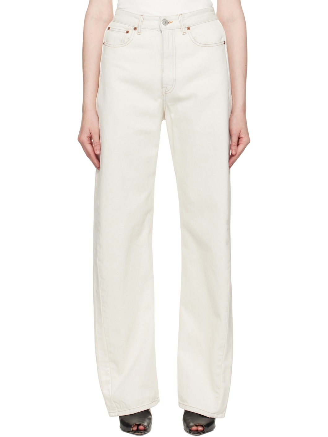 Non-stretch denim jeans. · Belt loops · Five-pocket styling · Zip fly · Satin trim at outseams · Cutout and white stitching at back waist · Logo patch at back pocket · Logo-engraved silver- and copper-tone hardware · Contrast stitching in tan Supplier color: Off white Body: 100% cotton. Lining: 65% polyester, 35% cotton. Made in Italy 251188F069024