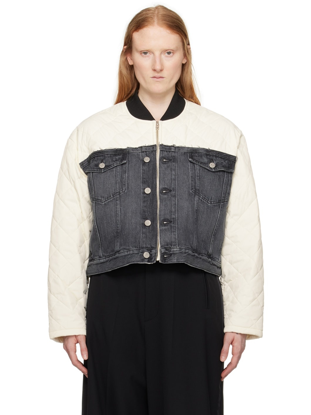 Insulated quilted nylon taffeta and non-stretch denim jacket. Fading and raised seams throughout. · Paneled construction · Rib knit stand collar · Zip closure · Loose threads at front and back · Flap pockets and welt pockets · White stitching at back yoke · Adjustable button tabs at back hem · Partial plain-woven lining · Logo-engraved gunmetal-tone hardware Supplier color: Off white/Grey Body 1: 100% polyamide. Body 2: 100% cotton. Trim: 95% polyester, 3% polyamide, 2% elastane. Fill: 100% polyester. Lining: 100% cotton. Made in Italy 241188F060005