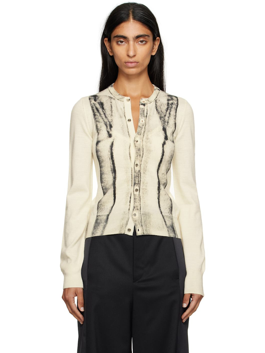 Knit virgin wool-blend cardigan. · Rib-knit crewneck, hem, and cuffs · Button closure · Spray-dyed detailing at front and sleeves · White stitching at back collar Supplier color: Off white 50% virgin wool, 50% acrylic. Made in Romania 252188F095003