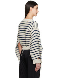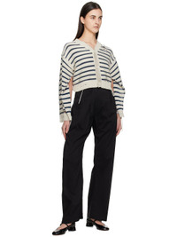 5-gauge knit cotton cardigan. Distressing throughout. · Rib-knit Y-neck, hem, and cuffs · Button closure · Dropped shoulders · Slit at sleeves · White stitching at back collar Supplier color: Chalk/Navy 100% cotton. Made in Italy 251188F095001