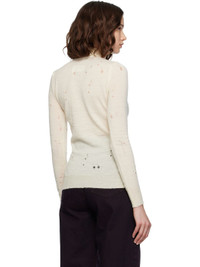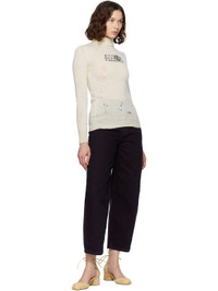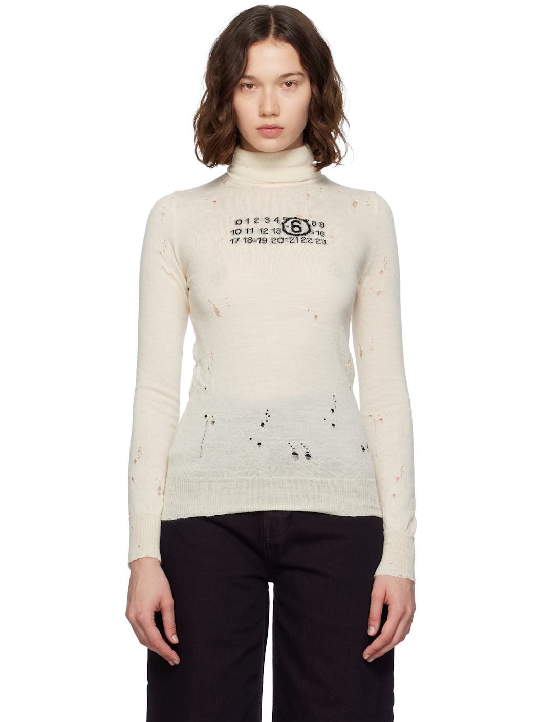Knit virgin wool turtleneck. · Distressing throughout · Rib-knit collar, hem, and cuffs · Jacquard logo at chest · White stitching at back collar Supplier color: White 100% virgin wool. Made in Italy 252188F099004