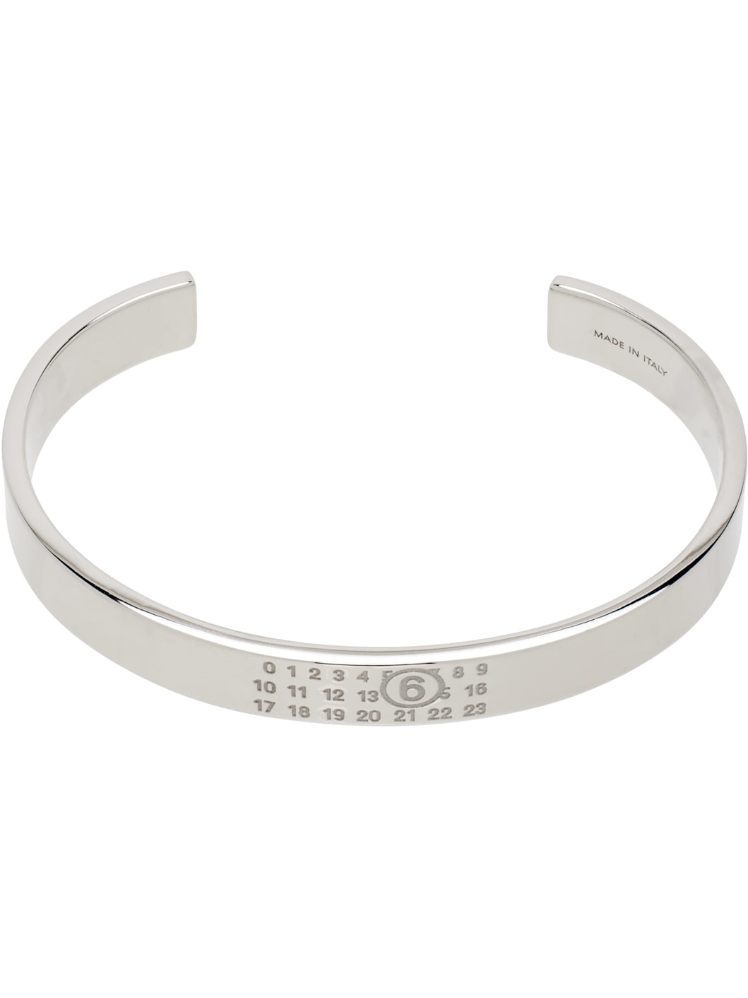 Open cuff bracelet in polished silver-tone brass. Logo engraved at face. Supplier color: Polished palladio Brass. Made in Italy 251188F020005