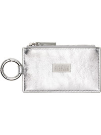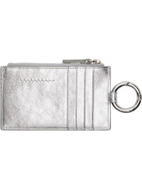 Buffed calfskin wallet. · Rubberized logo patch at face · Hinged ring at side · Signature white stitching at back face · Four card slots · Zip coin compartment · Moire lining · H3" x W5" x D0.5" Supplier color: Silver Body: 100% calfskin. Lining: 100% viscose. Made in Italy 261188F040001
