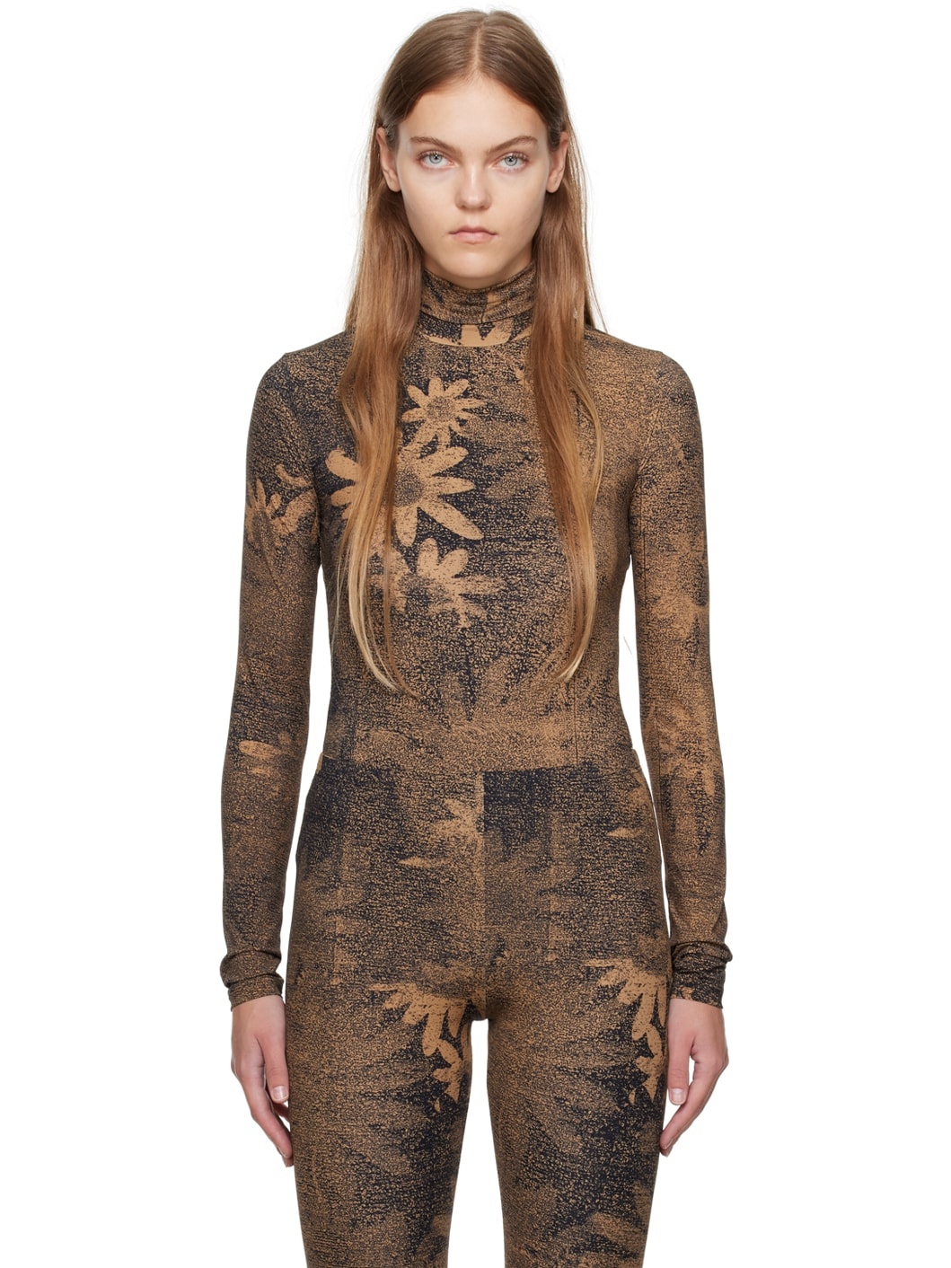 Stretch nylon jersey bodysuit. Graphic pattern printed throughout. · Turtleneck · Press-stud fastening at bottom · White stitching at back collar Supplier color: Tan/Black