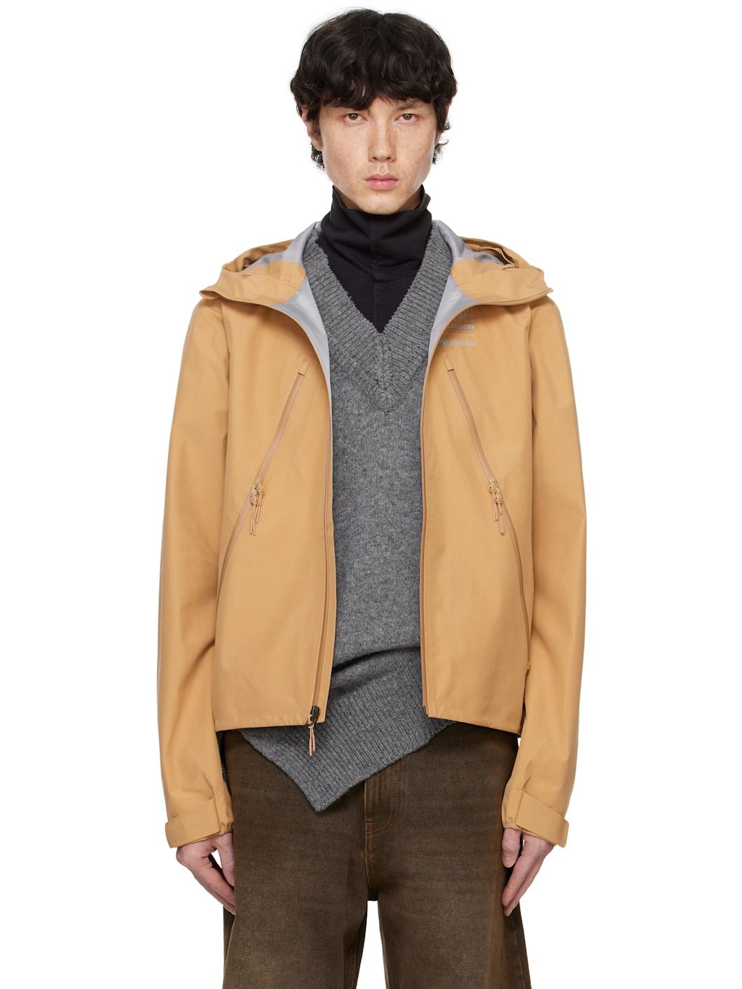 GORE-TEX® polyester canvas jacket. BlueSign®- and Oeko-Tex® Standard 100- certified. · Windproof, waterproof, and breathable · Concealed bungee-style drawstring at hood and hem · Zip closure · Reflective logo printed at chest · Zip pockets · Droptail hem · Zip gusset at underarms · Velcro tab at partially elasticized cuffs · White stitching at back collar · Taped seams at interior · Unlined Part of the MM6 Maison Margiela x Salomon collaboration. Supplier color: Iced coffee