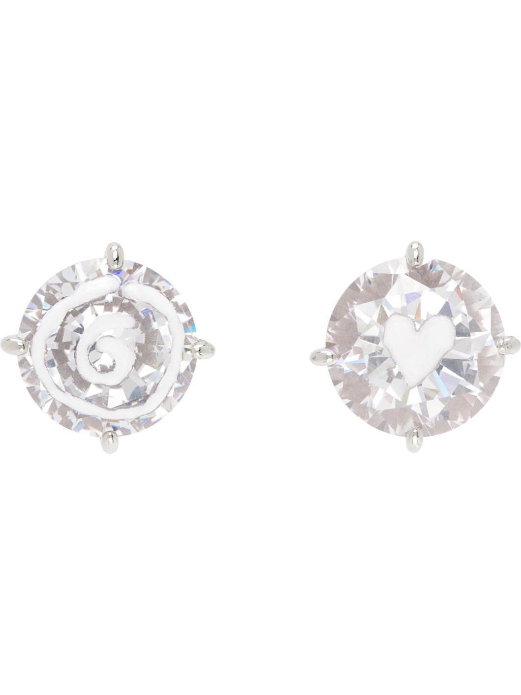 Pair of stud earrings in silver-tone brass. · White enameled logo and graphic at face · Prong-set cubic zirconia stone · Post-stud fastening · D0.5" Supplier color: Polished palladio Brass, cubic zirconia, enamel. Made in Italy 252188M144009