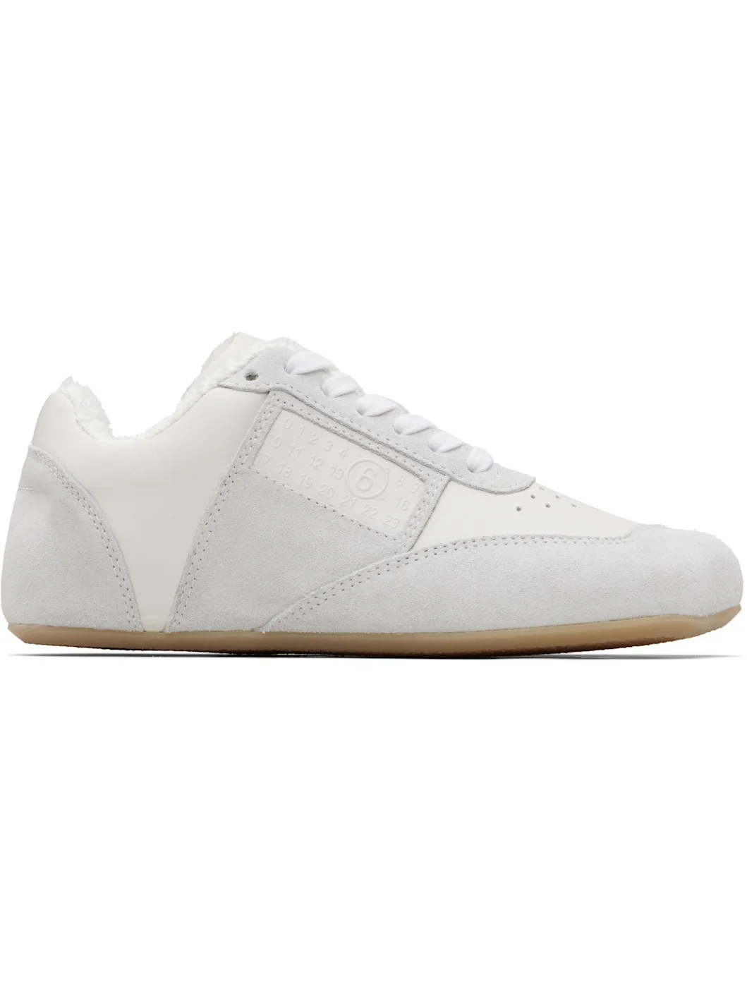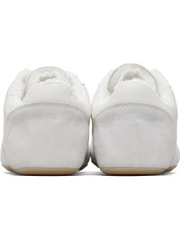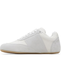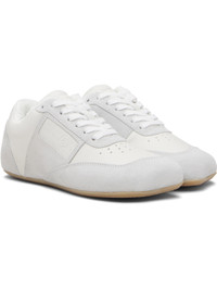 Low-top buffed calfskin and calfskin suede sneakers. · Smudging throughout · Modified square toe · Perforations at vamp · Lace-up closure · Logo embossed at padded tongue · Padded collar · Logo embossed at outer side · Signature white stitching at heel counter · Terrycloth lining · Treaded rubber sole Supplier color: White Upper: calfskin. Sole: rubber. Made in Italy 261188F128009