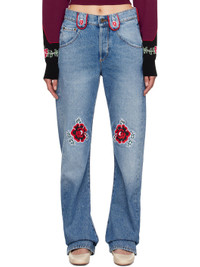 Straight-leg non-stretch denim jeans. Fading, piping, and floral graphics embroidered throughout. · Belt loops · Five-pocket styling · Button-fly · Logo patch at back waistband · Contrast stitching in tan Supplier color: Blue wash Body: 100% cotton. Trim: 100% polyester. Made in Italy 242943F069002