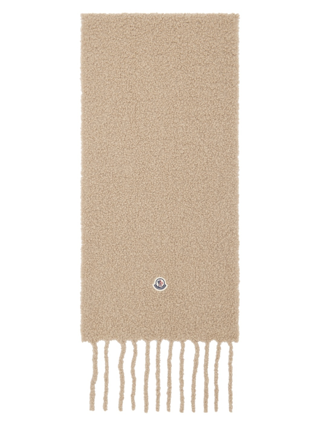 Rectangular boucle knit alpaca-blend scarf in beige. · Felted logo patch at face · Fringed detailing at ends · H80" x W11.5" Supplier color: Beige 90% alpaca, 10% polyamide. Made in Italy 242111F028007