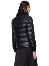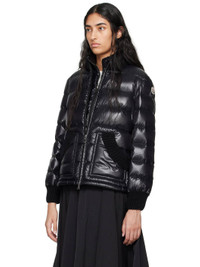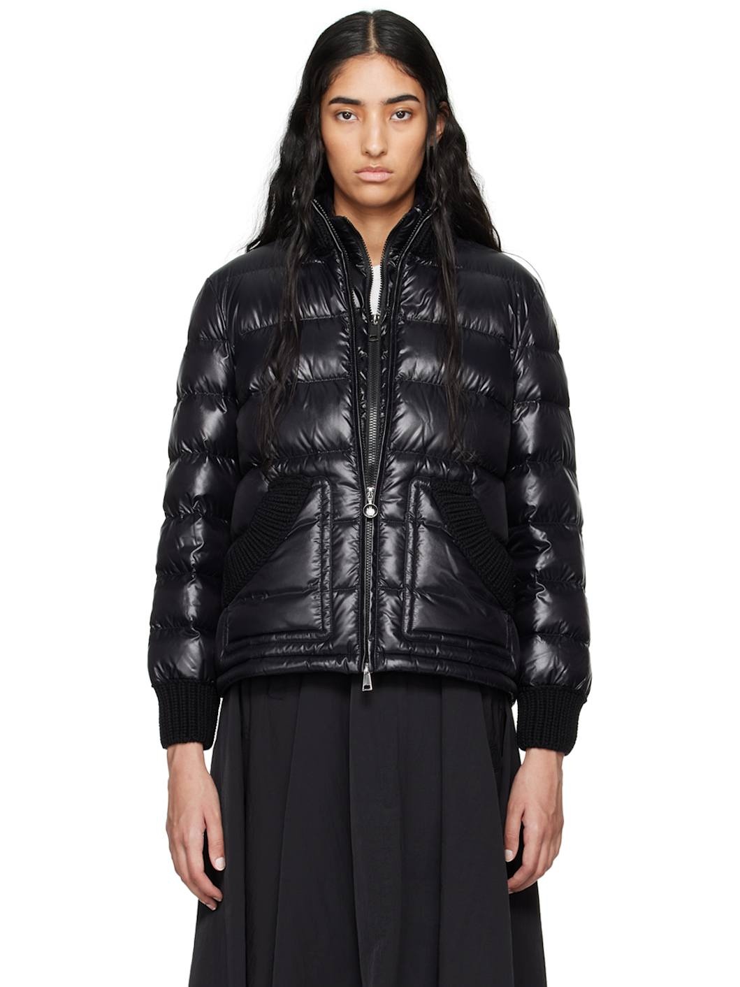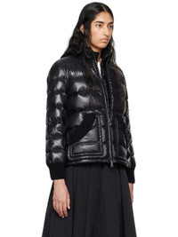 Lightweight and water-repellent DIST-certified down-filled quilted nylon laque jacket. · Rib knit stand collar, hem, and cuffs · Two-way zip closure · Patch pockets · Bungee-style drawstring at hem · Tricolor felted logo patch at sleeve · Fully lined Supplier color: Black Fill: 90% goose down, 10% feather. 100% polyamide. Made in Romania 242111F061034