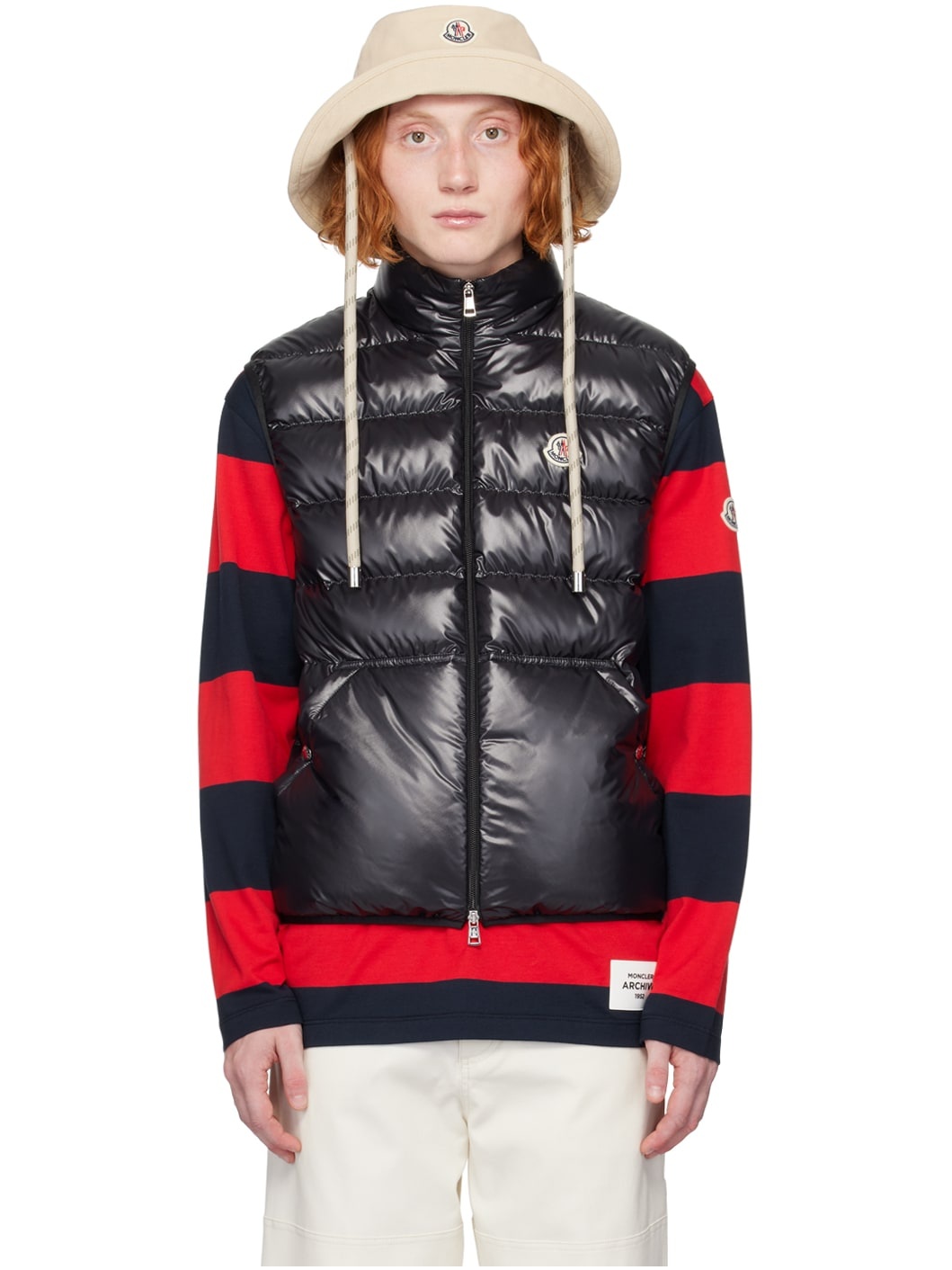 DIST-certified down-filled and quilted polyester laque vest. · Stand collar · Two-way zip closure · Tricolor felted logo patch at chest · Press-stud welt pockets · Locker loop at inner collar · Zip pocket at interior · Fully lined Supplier color: Black Fill: 90% goose down, 10% feather. Body: 100% polyester. Lining: 100% polyester. Made in Romania 242111M178149