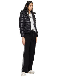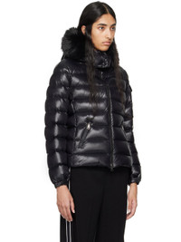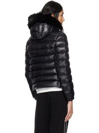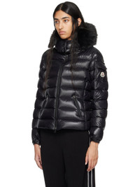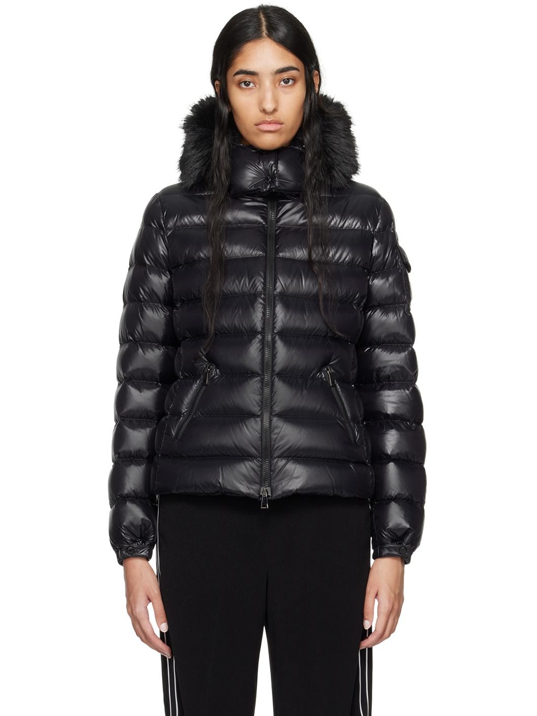 Down-filled quilted nylon laque jacket. · Detachable faux-fur trim at detachable hood · Stand collar · Two-way zip closure · Zip pockets · Patch pocket and tricolor felted logo patch at sleeve · Press-stud fastening at elasticated cuffs · Full nylon laque lining Supplier color: Black Fill: 90% down, 10% feather. Body: 100% polyamide. Lining: 100% polyamide. Trim: 100% polyester. Made in Armenia 242111F061096