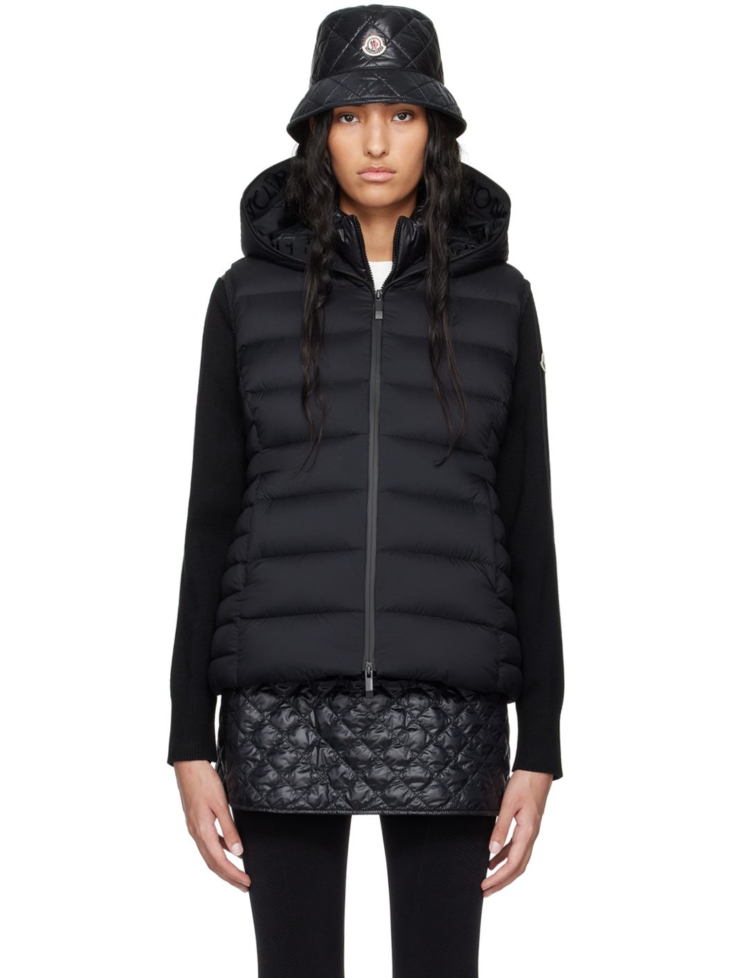 Lightweight DIST-certified down-filled quilted nylon longue saison vest. · Logo printed at inner hood · Zip closure extends to hood · Partially elasticized hem · Zip seam pockets · Elasticized armscyes · Full satin lining Supplier color: Black Fill: 90% goose down, 10% feather. Body: 100% polyamide. Lining: 100% polyester. Made in Romania 242111F061030