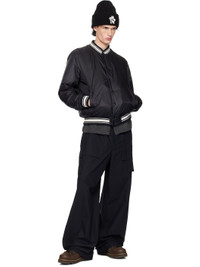 Reversible down-filled nylon satin bomber jacket. Reverse in black quilted cotton jersey. · DIST-certified down · Striped rib-knit stand collar, hem, and cuffs · Two-way zip closure with press-stud placket · Welt pockets · Felted logo patch at sleeve · Logo graphic appliques at back · Logo applique and welt pockets at interior Supplier color: Black Fill: 90% down, 10% feather. Body: 100% polyamide. Lining: 100% cotton. Made in Romania 251111M175002