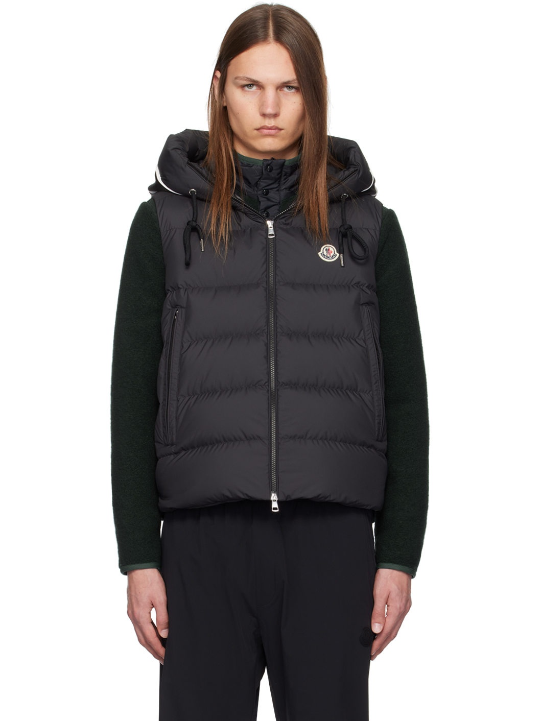 Down-filled quilted nylon taffeta vest. · Knit panel and logo bonded at hood · Drawstring at hood · Two-way zip closure · Felted logo patch at chest · Zip pockets · Zip pocket at interior · Full quilted satin lining · Logo-engraved silver-tone hardware Supplier color: Black Fill: 90% goose down, 10% goose feather. Body: 100% polyester. Lining: 100% polyester. Made in Moldova 242111M178106