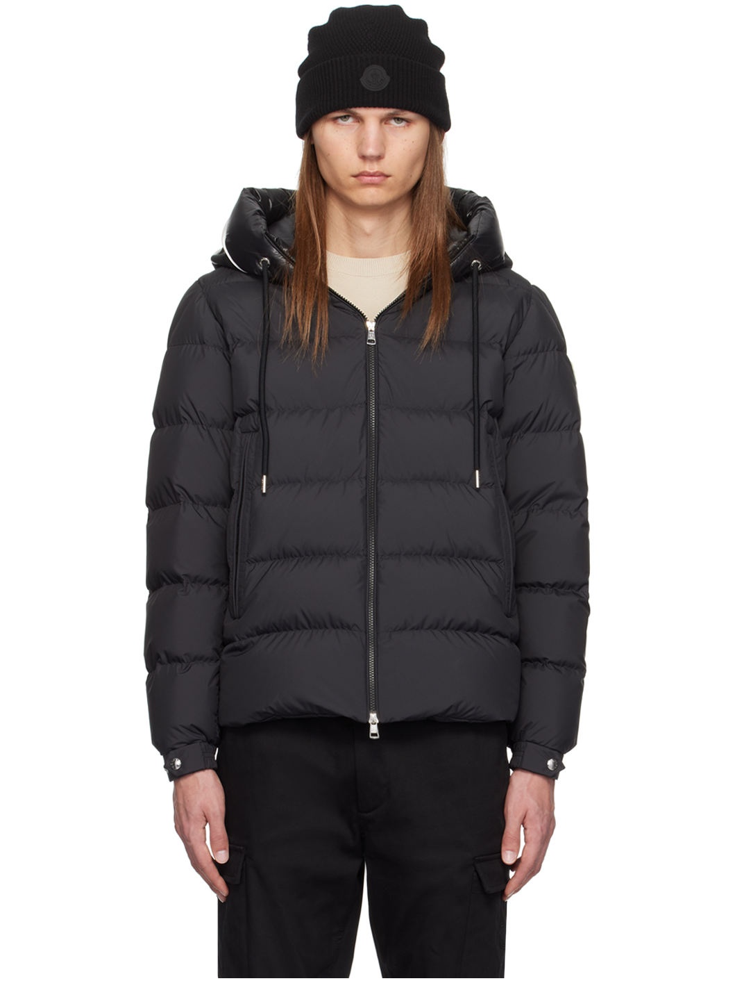 DIST-certified down-filled quilted polyester taffeta jacket. · Knit panel and logo bonded at hood · Drawstring at hood · Two-way zip closure · Zip pockets · Felted logo patch at chest · Adjustable press-stud tab at elasticized cuffs · Zip pocket at interior · Full quilted satin lining · Logo-engraved silver-tone hardware Supplier color: Black Fill: 90% goose down, 10% goose feather. 100% polyester. Lining: 100% polyester. Made in Armenia 242111M178105