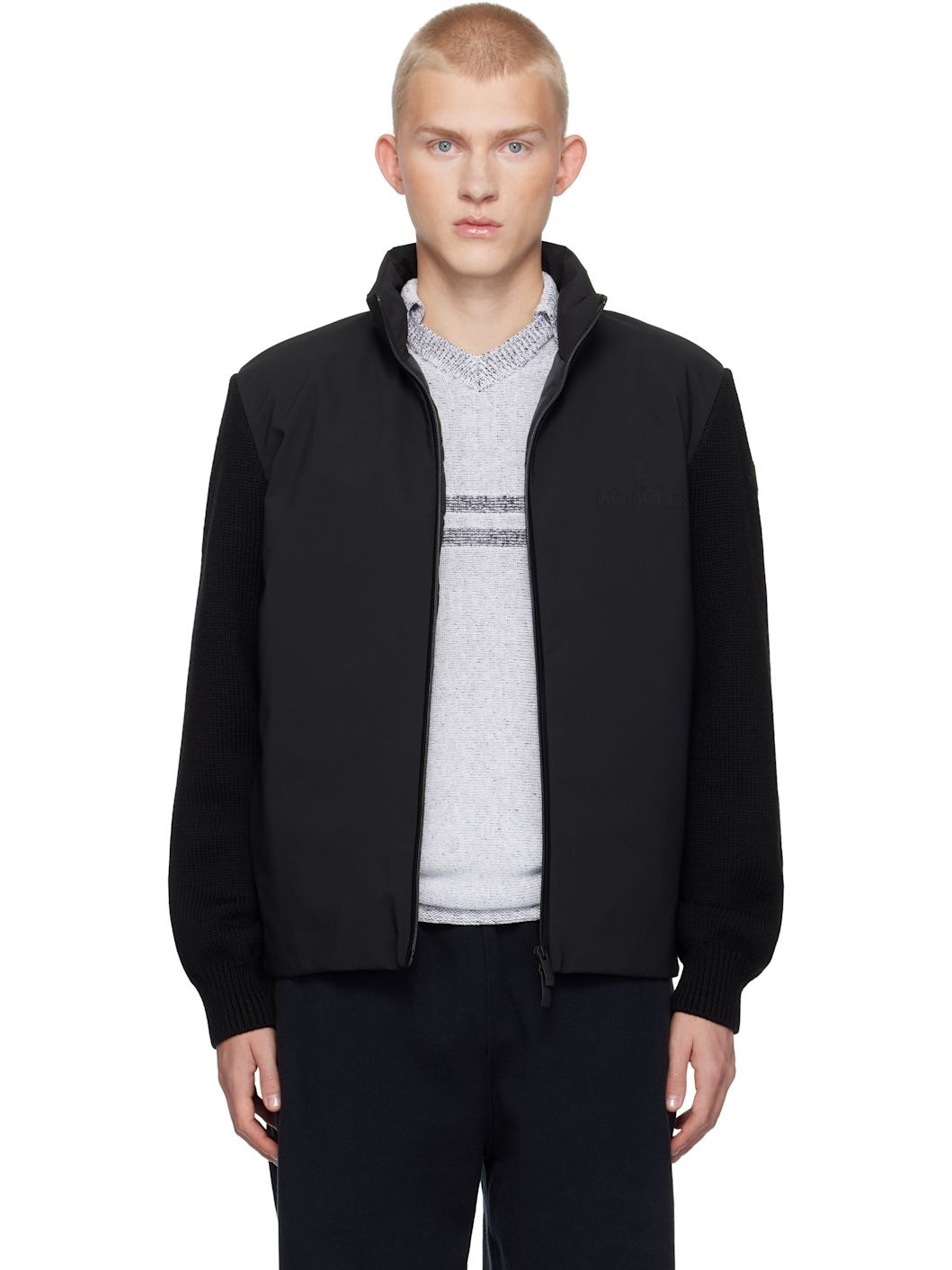 Down-filled polyester twill and knit virgin wool jacket. · Stand collar · Two-way zip closure · Embossed logo at chest · Zip pockets · Rubberized logo patch at sleeve · Rib-knit cuffs and back hem · Partial quilted lining Supplier color: Black Fill: 90% goose down, 10% goose feather. Body 1: 100% polyester. Body 2: 100% virgin wool. Trim 1: 100% polyester. Trim 2: 100% polyester. Lining: 100% polyester. Made in Moldova 242111M180111