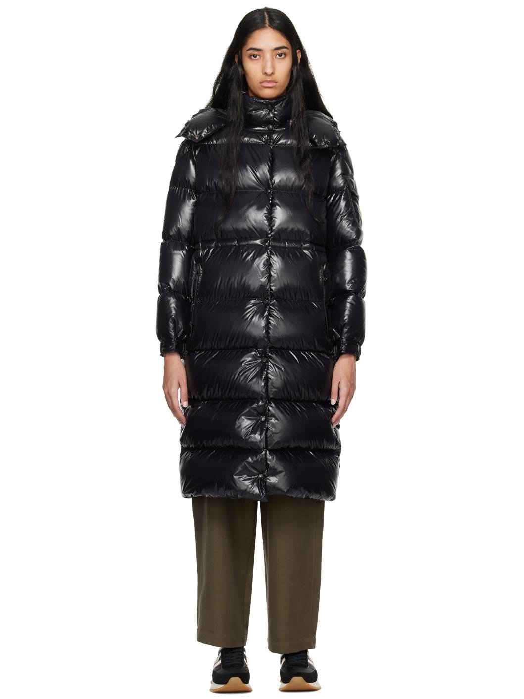 Down-filled quilted nylon laque coat. · Bungee-style drawstring at detachable hood and hem · Funnel neck · Two-way zip closure with press-stud placket · Zip pockets · Patch pocket and tricolor felted logo patch at sleeve · Adjustable press-stud fastening at elasticized cuffs · Concealed bungee-style drawstring at inner waist · Full nylon laque lining · Tonal logo-engraved hardware Supplier color: Black Fill: 90% goose down, 10% feather. Body: 100% polyamide. Lining: 100% polyamide. Trim: 100% polyamide. Made in Romania 242111F061056
