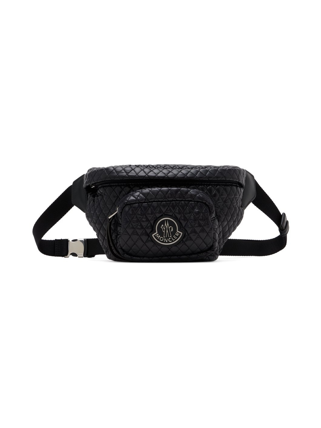 Padded quilted nylon laque belt bag in black. · Grained calfskin trim throughout · Adjustable webbing crossbody strap · Logo hardware at face · Zip pocket at face · Zip closure · Water-repellant nylon taffeta lining · H6.5" x W8.5" x D2.25" Supplier color: Black Body: 100% polyamide. Trim: 100% calfskin. Fill: 100% polyester. Lining: 100% polyamide. Made in Romania 242111F045000