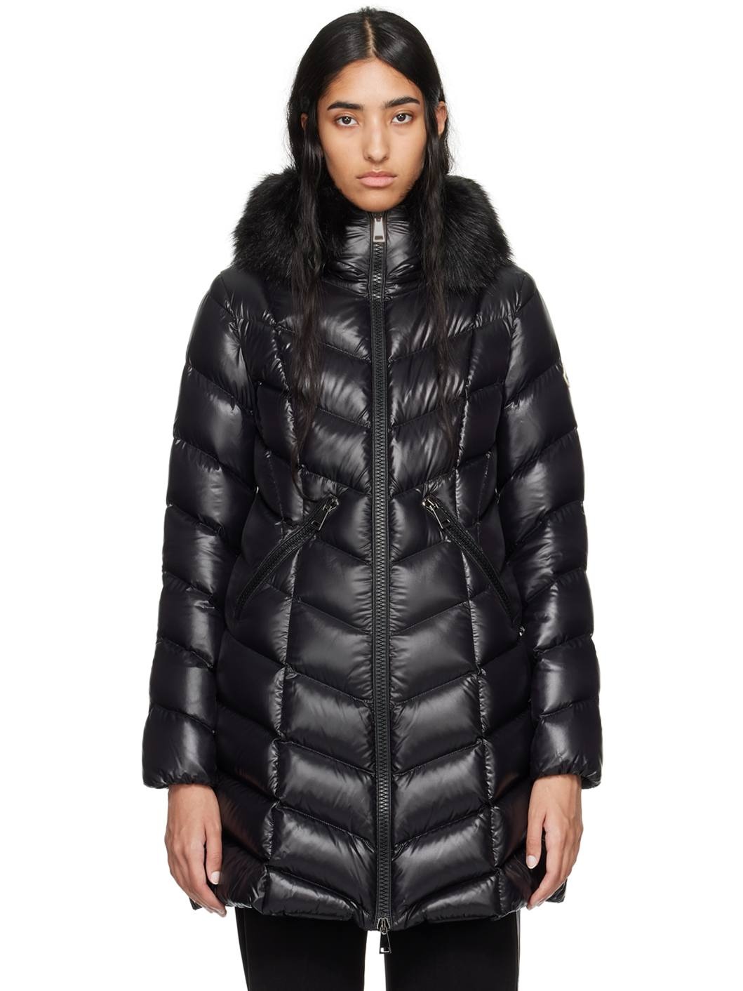 Down-filled chevron-quilted nylon laque coat. · Detachable faux-fur trim at hood · Two-way zip closure · Zip pockets · Tricolor felted logo patch at sleeve · Elasticated cuffs · Full nylon laque lining Supplier color: Black Fill: 90% down, 10% feather. Body: 100% polyamide. Lining: 100% polyamide. Trim: 59% modacrylic, 32% acrylic, 9% polyester. Made in Armenia 242111F061095