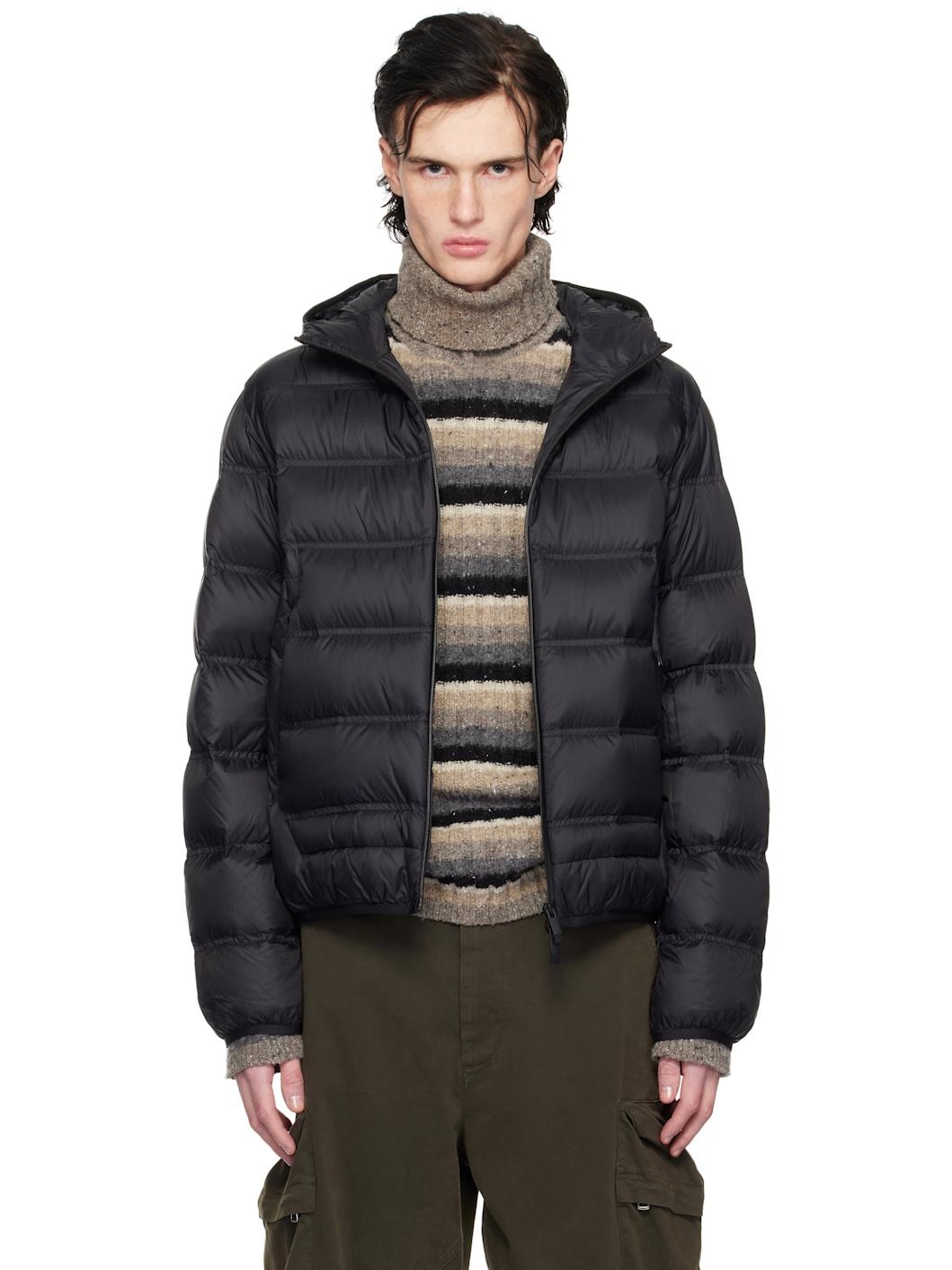 Down-filled and quilted nylon satin and polyester taffeta jacket. · DIST-certified down · Elasticized hood, hem, and cuffs · Reflective logo at hood and back · Two-way zip closure · Zip pockets · Rubber logo patch at sleeve · Fully lined Supplier color: Black Fill: 90% down, 10% feather. Body 1: 100% polyamide. Body 2: 100% polyester. Lining: 100% polyamide. Made in Romania 251111M178011