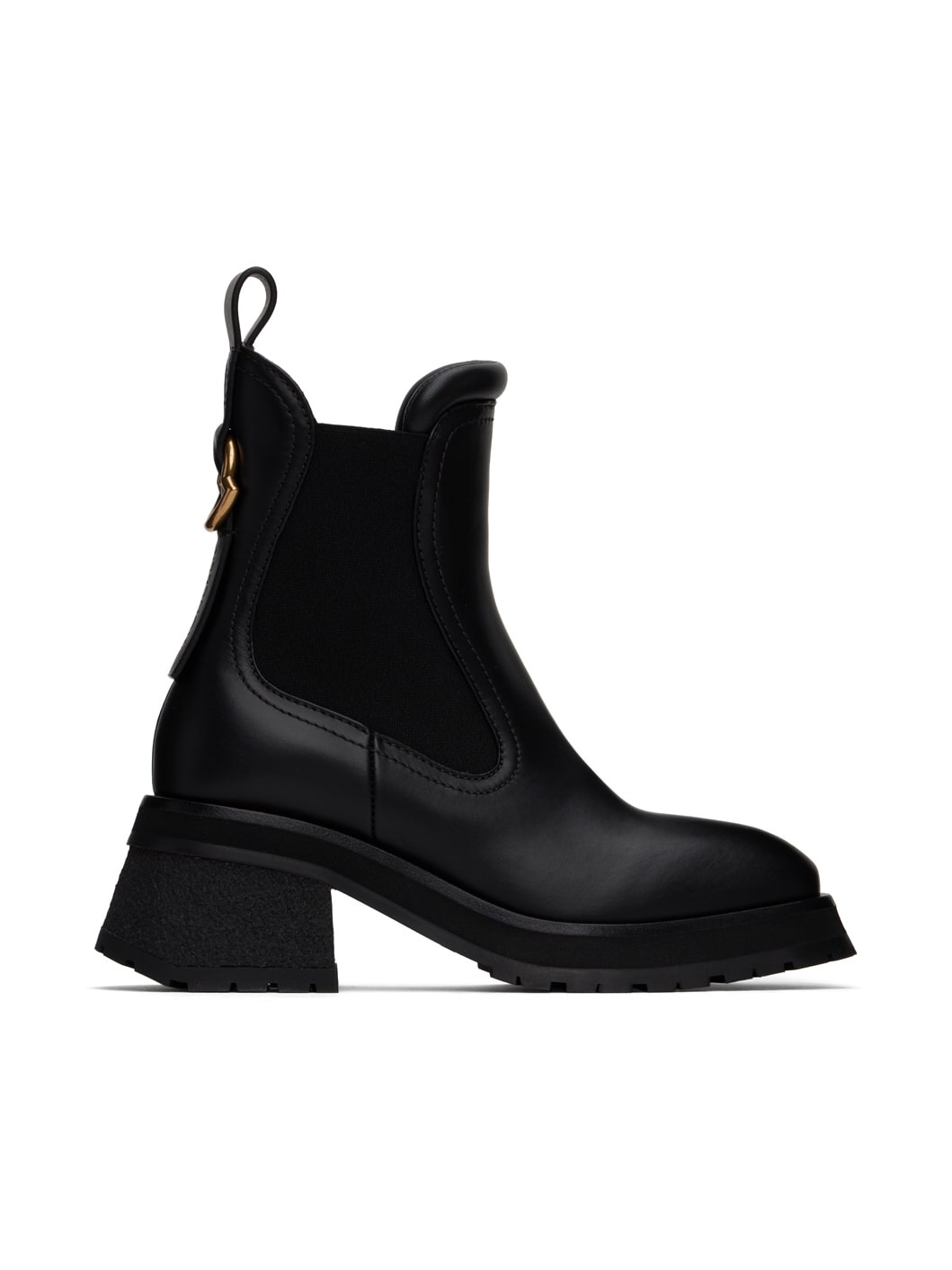 Ankle-high buffed calfskin Chelsea boots in black. · Square toe · Padded trim at collar · Elasticized gusset at sides · Pull-loop at heel · Logo hoop at heel counter · Buffed leather lining · Stacked foam rubber midsole · Beveled rubber block heel · Treaded rubber sole · Heel: H2.75" Supplier color: Black Upper: calfskin. Sole: rubber. Made in Italy 242111F113006