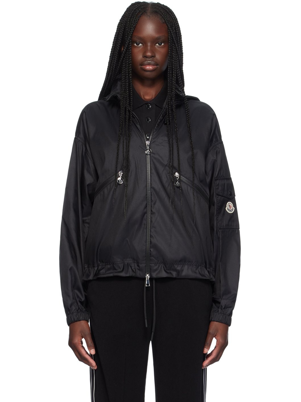 Water-repellent lightweight nylon canvas jacket. · Bungee-style drawstring at stowaway hood · Stand collar · Two-way zip closure · Zip pockets · Bungee-style drawstring at hem · Flap pocket and felted logo patch at sleeve · Partial nylon mesh lining Supplier color: Black 100% polyamide. Made in Romania 242111F063004