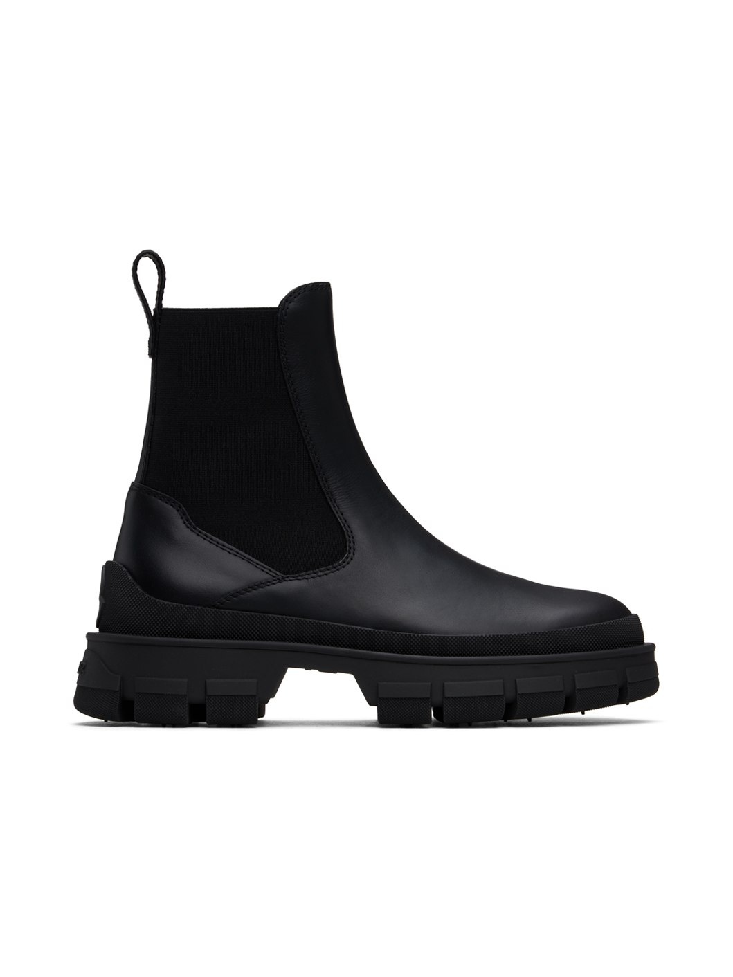 Ankle-high buffed leather Chelsea boots in black. · Elasticized gussets at sides · Pull-loop at heel collar · Logo embossed at heel counter and heel · Buffed leather lining · Lugged TPU sole · Heel: H1.5" Supplier color: Black Upper: leather, textile. Sole: rubber. Made in Italy 242111F113004