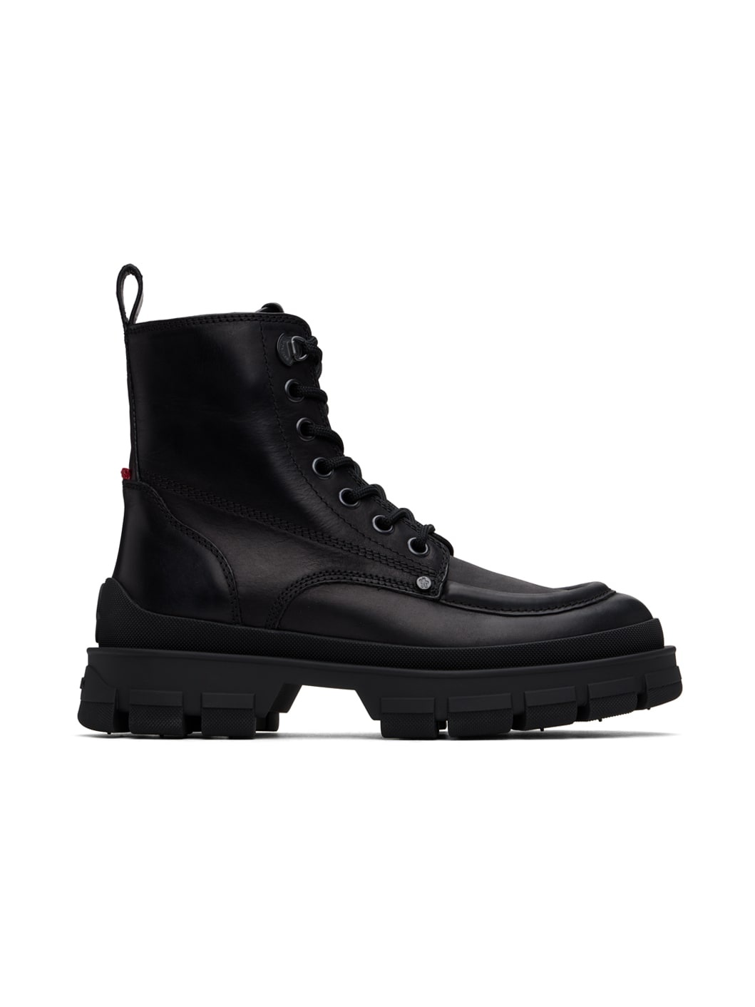 Ankle-high waxed calfskin boots in black. · Moc toe · Lace-up closure · Logo-engraved rivets at vamp · Leather logo flag at tongue · Pull-loop at heel collar · Tricolor grosgrain flag at heel counter · Logo embossed at heel counter and heel · Lugged TPU sole Supplier color: Black Upper: calfskin. Sole: thermoplastic polyurethane. Made in Italy 242111M255000
