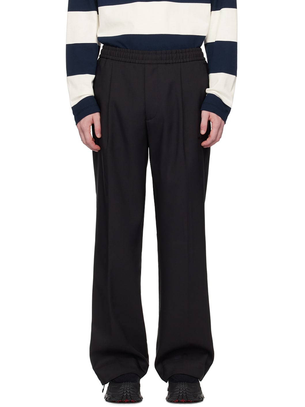 Lightweight polyester twill trousers. · Concealed drawstring at elasticized waistband · Four-pocket styling · Zip-fly · Pleats at legs · Logo plaque at front · Concealed drawstring at cuffs · Rubberized logo applique at back Supplier color: Black 100% polyester. Made in Romania 242111M191037