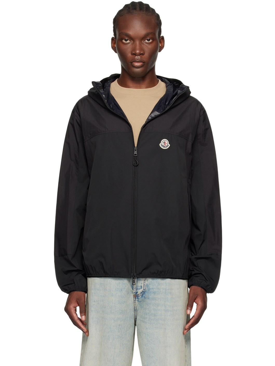 Polyester taffeta and nylon- and cupro-blend ripstop jacket. · Paneled construction · Elasticized trim and bungee-style drawstring at hood · Funnel neck · Two-way zip closure · Felted logo patch at chest · Zip pockets · Elasticized trim at hem and cuffs · Partial laque lining · Logo-engraved black hardware Supplier color: Black Body 1: 100% polyester. Body 2: 89% polyamide, 11% cupro. Lining: 100% polyamide. Made in Romania 242111M180015