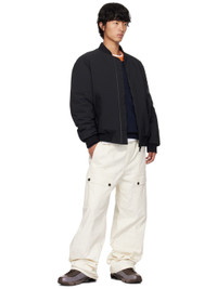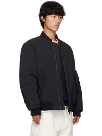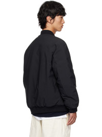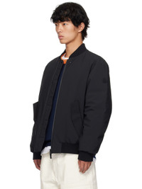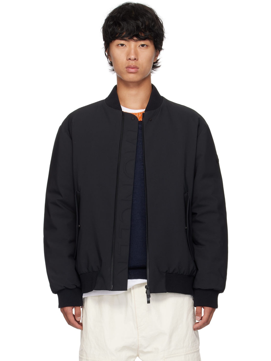 DIST-certified down-filled polyester sateen bomber jacket. · Rib knit stand collar, hem, and cuffs · Concealed embossed logo at two-way zip closure · Concealed press-stud fastening at placket · Zip pockets and flap pockets · Rubberized logo patch at sleeve · Zip pocket at interior · Full quilted satin lining Supplier color: Black Fill: 90% goose down, 10% feather. 100% polyester. Made in Romania 242111M175002
