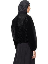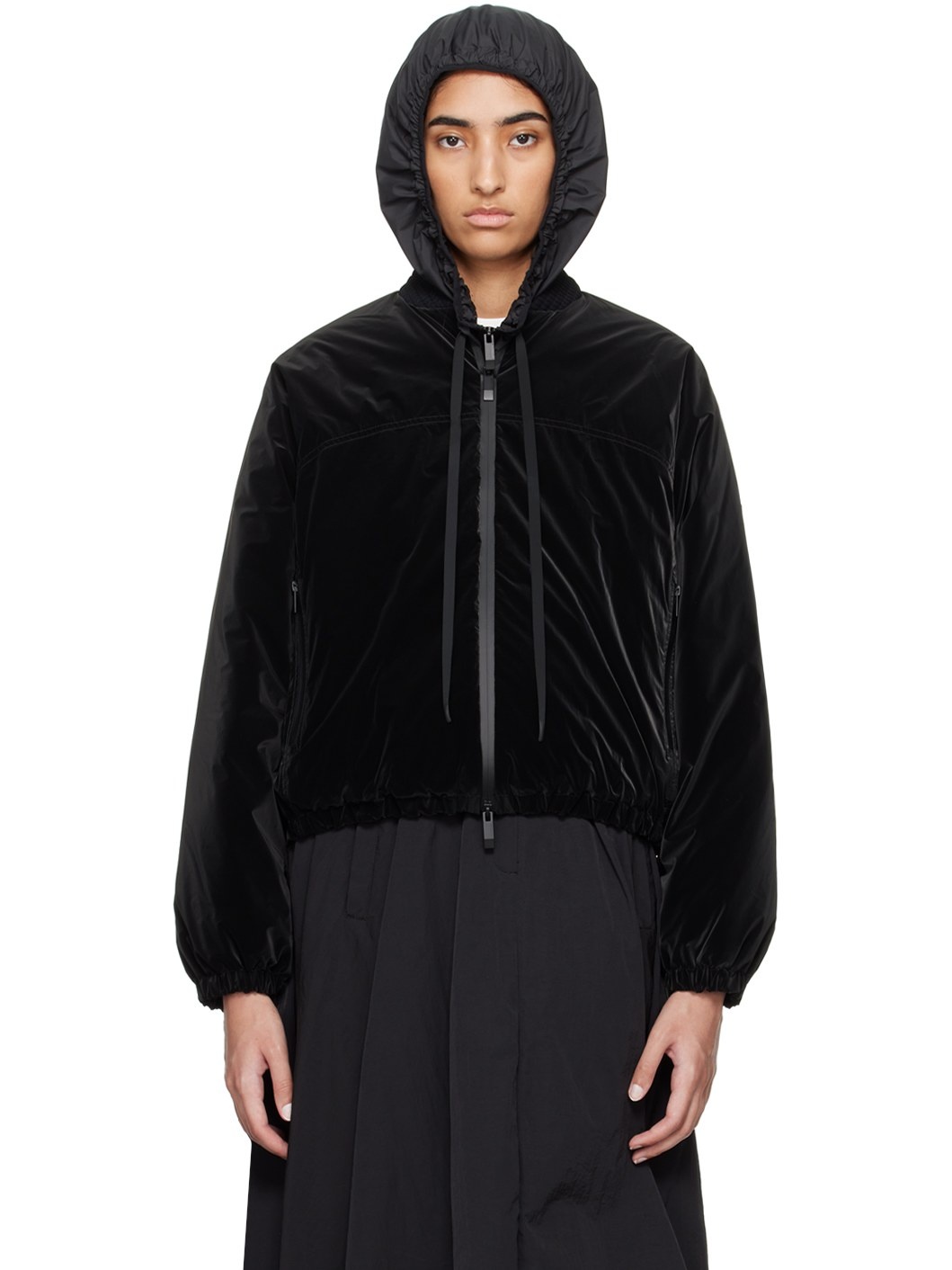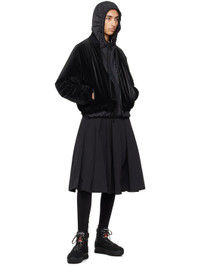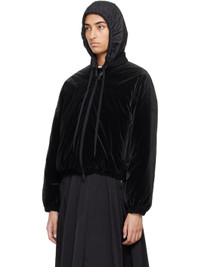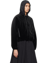 Down-filled coated nylon taffeta bomber jacket. · Rib knit stand collar · Two-way zip closure · Zip pockets · Elasticized cropped hem and cuffs · Rubberized logo patch at sleeve · Full micro ripstop lining · Logo-engraved black hardware Supplier color: Black Fill: 90% goose down, 10% goose feather. Body: 100% polyamide. Lining: 100% polyester. Made in Romania 242111F058000