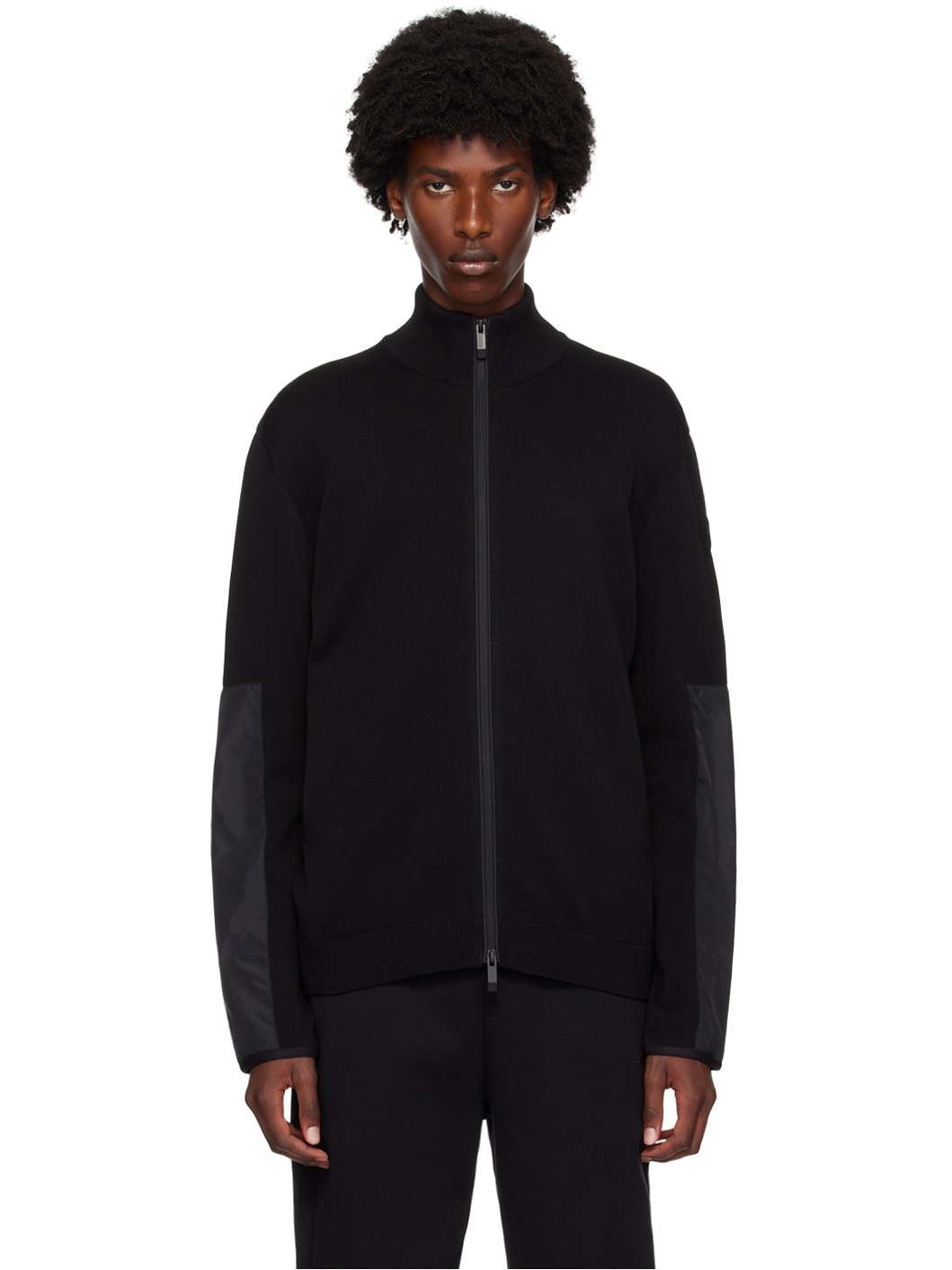 Knit cotton sweater. · Rib knit stand collar and hem · Two-way zip closure · Welt pockets · Nylon taffeta panel at sleeves Supplier color: Black Body: 100% cotton. Trim: 100% polyester. Made in Turkey 242111M202027