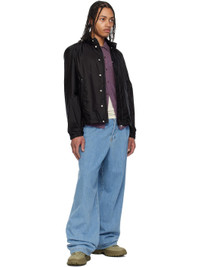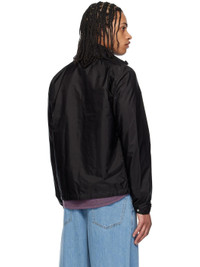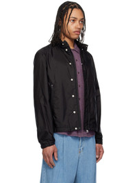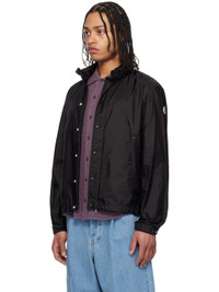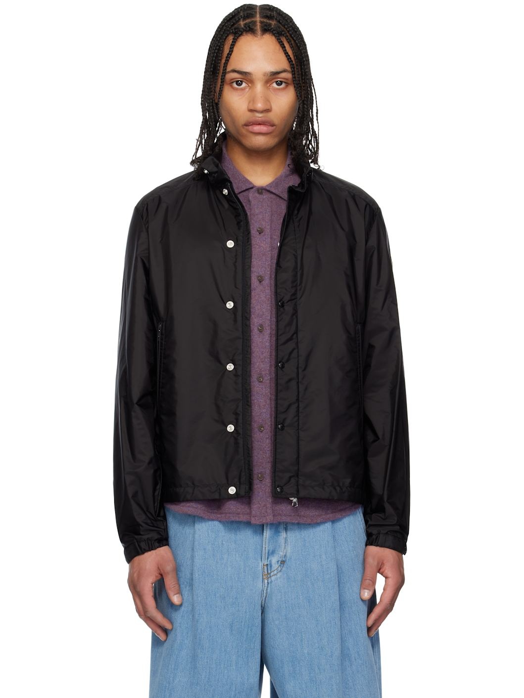 Recycled nylon satin jacket. · Zip stowaway hood at stand collar · Concealed two-way zip closure · Press-stud placket · Zip pockets · Bungee-style drawstring at hem · Felted logo patch at sleeve · Adjustable press-stud tab at elasticized cuffs · Patch pocket at interior · Unlined Supplier color: Black 100% recycled nylon. Made in Romania 251111M180110