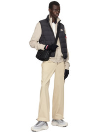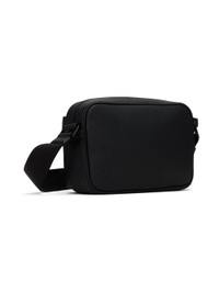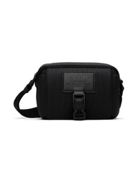 Water-repellent coated canvas messenger bag in black. · Buffed calfskin trim throughout · Adjustable crossbody strap · Logo patch at face · Magnetic buckle at flap pocket · Zip closure · Patch pocket at interior · Water-repellent taffeta lining · Logo-engraved black hardware · H6" x W8.75" x D3.5" Supplier color: Black Textile, calfskin. Made in Romania 242111M171009