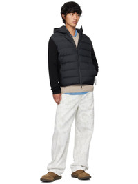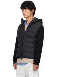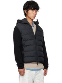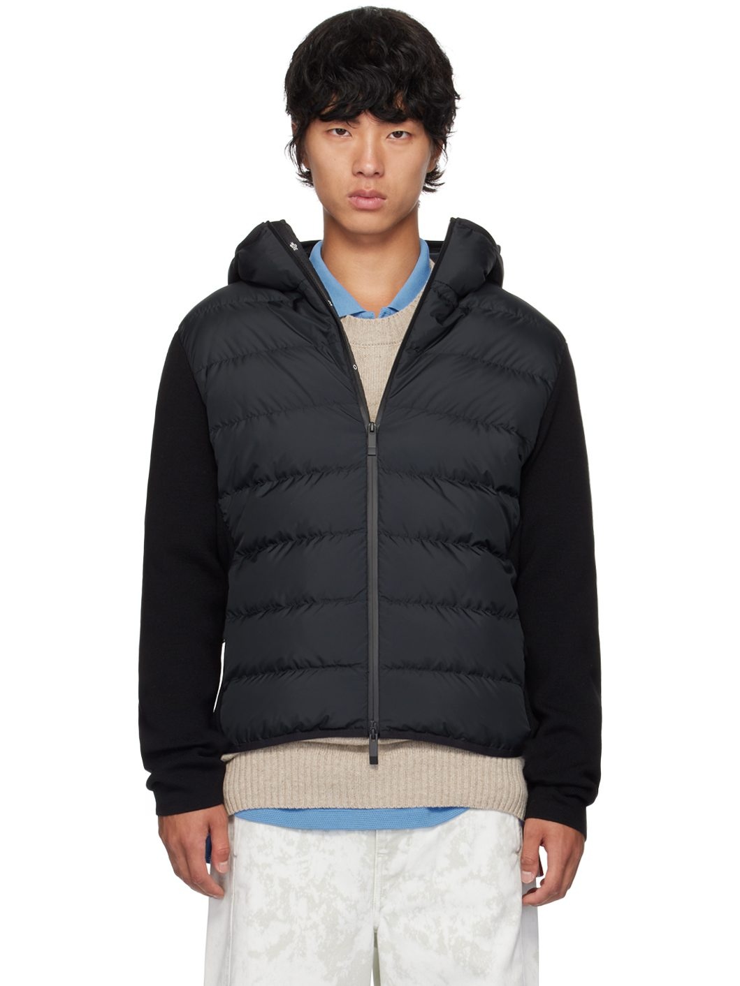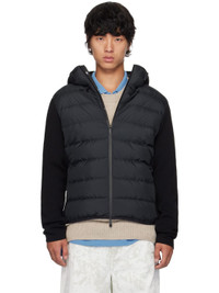 DIST-certified down-filled quilted polyester taffeta and rib knit wool-blend jacket. · Paneled construction · Hood at stand collar · Two-way zip closure · Zip pockets · Elasticized hem and cuffs · Rubberized logo patch at sleeve · Partial taffeta lining Supplier color: Black Fill: 90% goose down, 10% feather. Body 1: 100% polyester. Body 2: 95% wool, 5% polyester. Lining: 100% polyester. Made in Moldova 242111M178010
