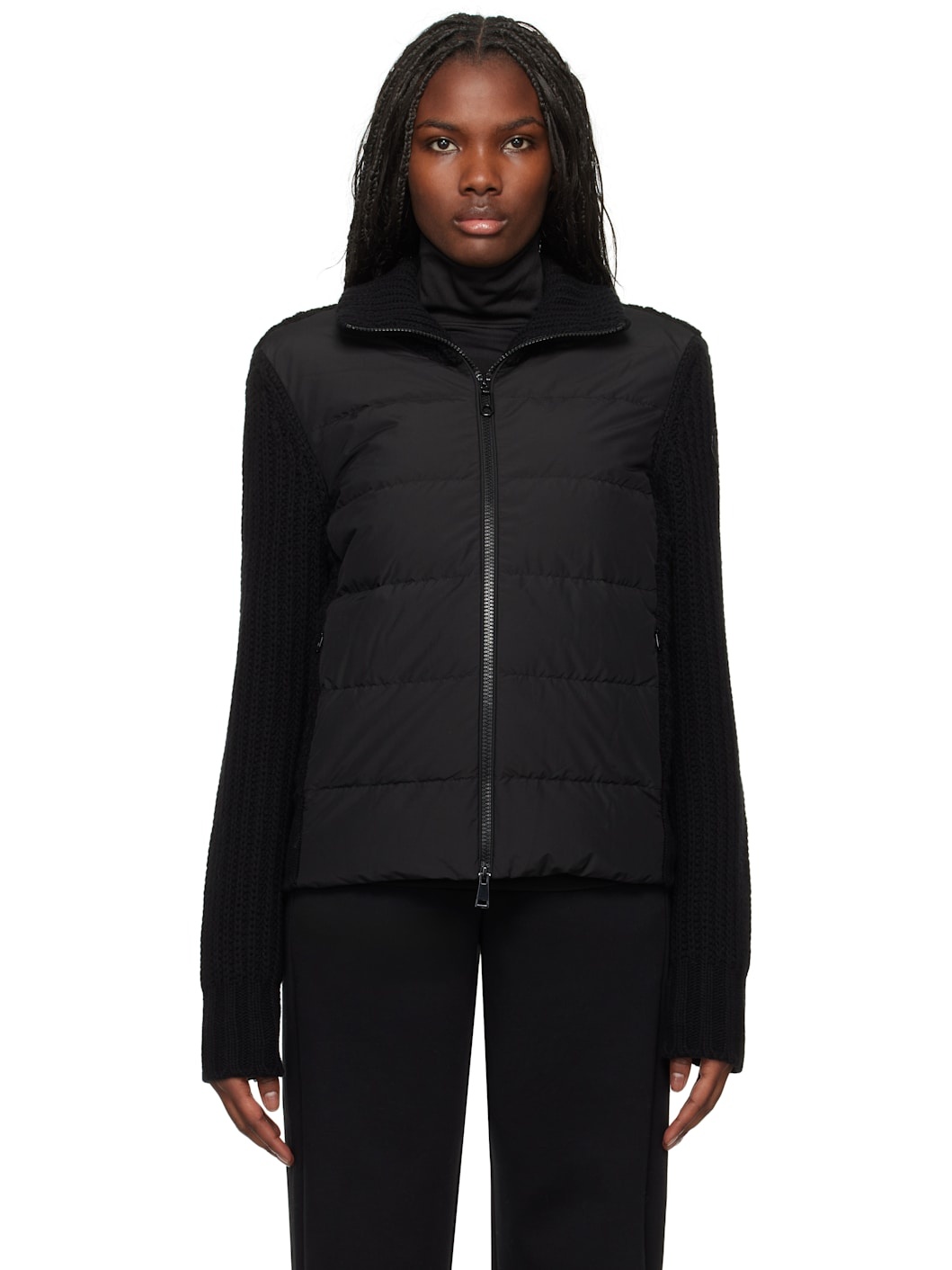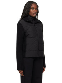 Rib-knit virgin wool- and cashmere-blend jacket. DIST-certified down-filled and quilted cotton-blend taffeta panel at front. · Paneled construction · Stand collar · Two-way zip closure · Zip pockets · Logo patch at sleeve · Partial satin lining Supplier color: Black Fill: 90% goose down, 10% feathers. Body 1: 90% virgin wool, 10% cashmere. Body 2: 73% cotton, 27% polyamide. Lining: 100% polyamide. Made in Moldova 242111F061054