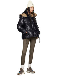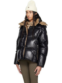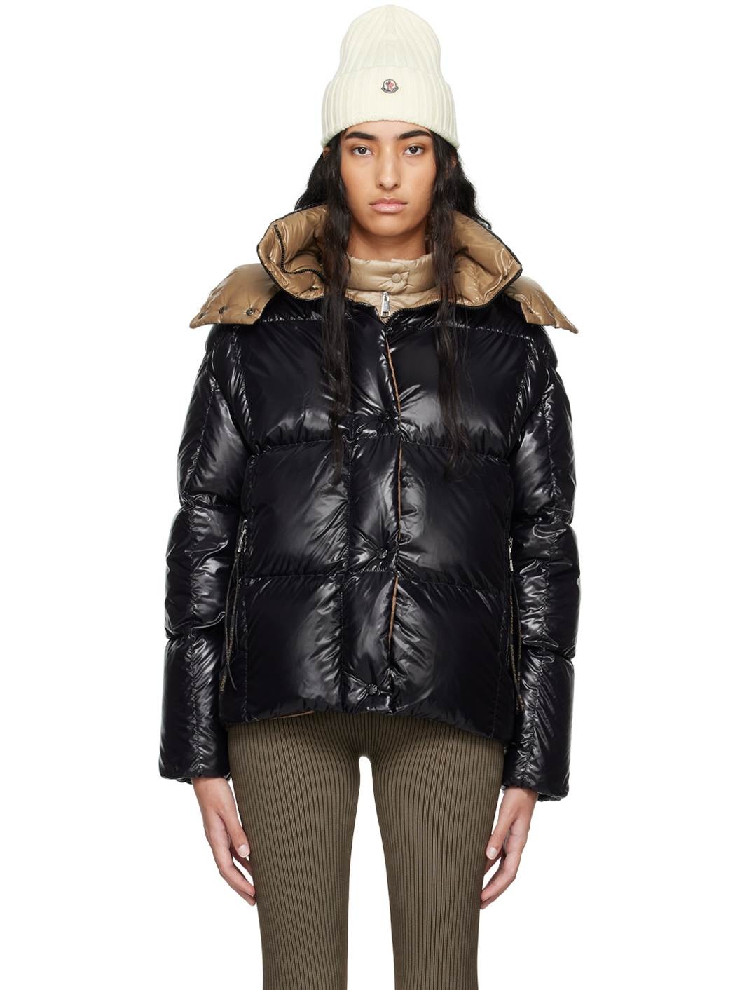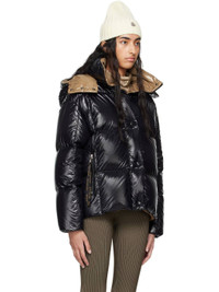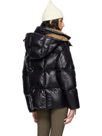 DIST-certified down-filled quilted nylon laque jacket. · Bungee-style drawstring at detachable hood · Funnel neck · Two-way zip closure with press-stud placket · Logo-woven pull-tab at zip pockets · Elasticized cuffs · Tricolor felted logo patch at sleeve · Locker loop at inner collar · Fully lined Supplier color: Black Fill: 90% goose down, 10% feather. 100% polyamide. Made in Serbia 242111F061003