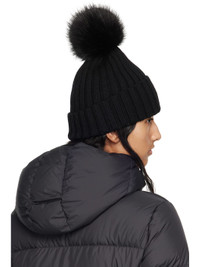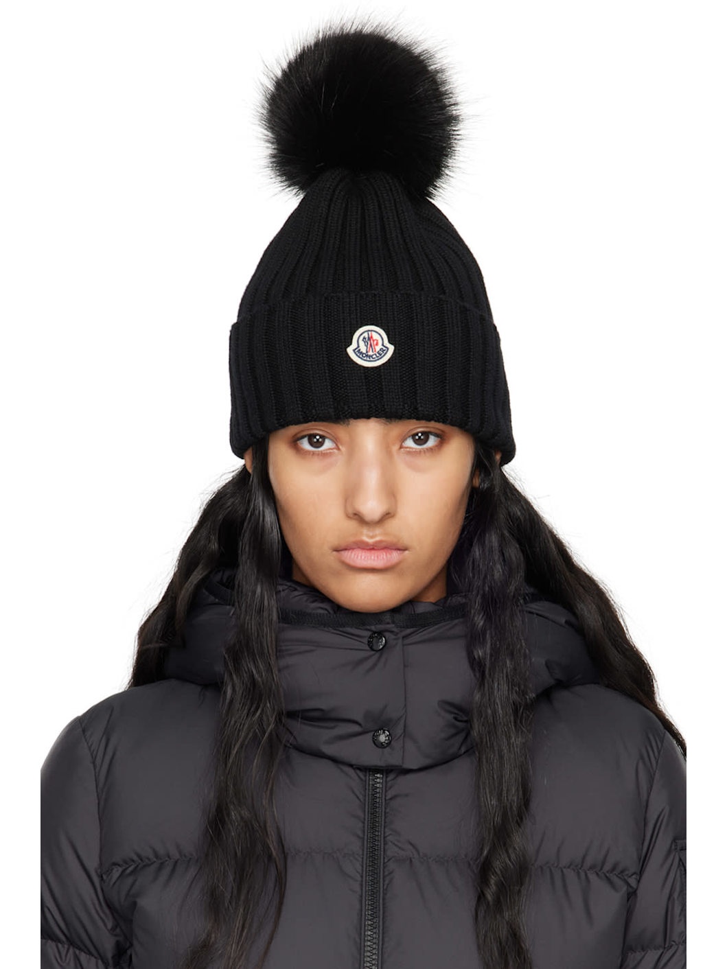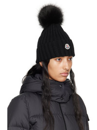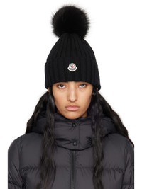 5-gauge rib knit virgin wool beanie in black. · Faux-fur pom-pom at crown · Felted logo patch at rolled brim Supplier color: Black Body: 100% virgin wool. Trim: 59% modacrylic, 31% acrylic, 10% polyester. Made in Bulgaria 242111F014029