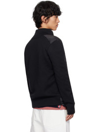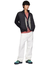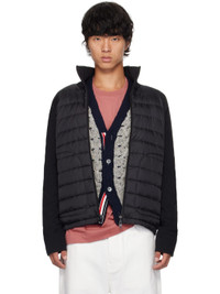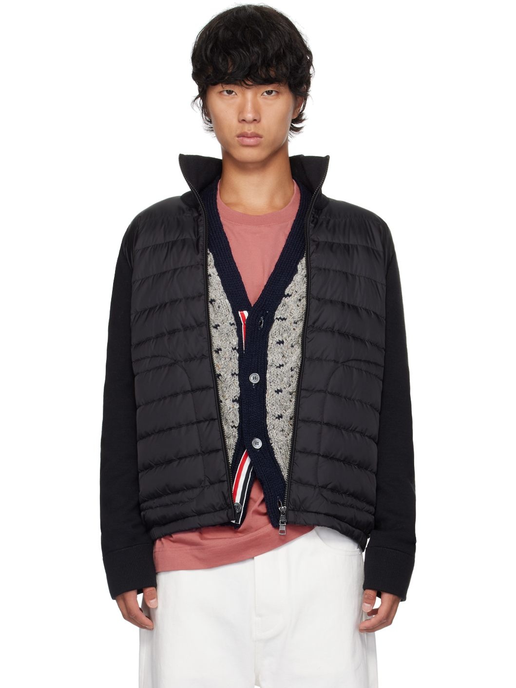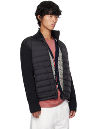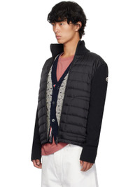DIST-certified down-filled quilted nylon taffeta and knit virgin wool-blend cardigan. · Paneled construction · Stand collar · Two-way zip closure · Zip pockets · Partially elasticized hem · Felted logo patch at sleeve · Partial taffeta lining Supplier color: Black Fill: 90% goose down, 10% feather. Body 1: 100% polyamide. Body 2: 50% virgin wool, 50% acrylic. Lining: 100% polyamide. Made in Moldova 242111M178003