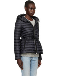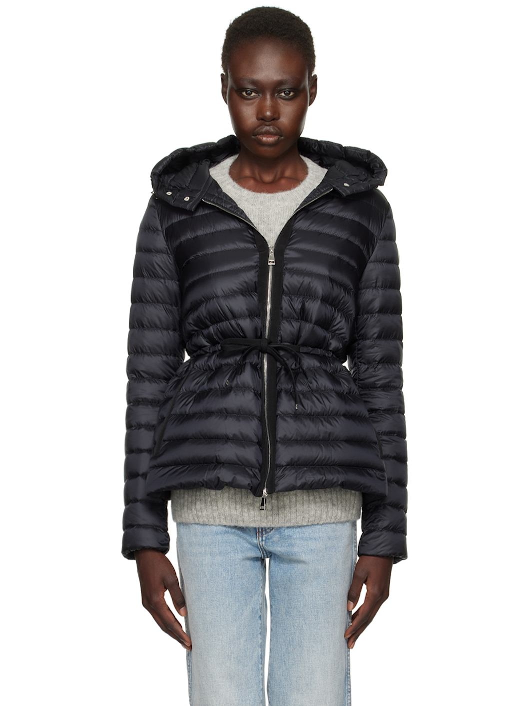 DIST-certified down-filled and quilted nylon satin jacket. Grosgrain trim throughout. · Bungee-style drawstring at hood · Stand collar · Zip closure · Zip pockets · Self-tie drawstring at waist · Tricolor felted logo patch at sleeve · Elasticized cuffs · Full nylon satin lining Supplier color: Black Fill: 90% down, 10% feather. Body: 100% polyamide. Lining: 100% polyamide. Trim: 100% polyamide. Made in Romania 242111F061002