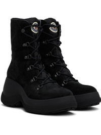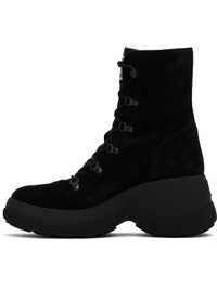 Ankle-high suede and nylon taffeta boots in black. · Water-repellent · Lace-up closure · Felted logo patch at padded tongue · Buffed leather lining · Logo embossed at heel · Lugged TPU sole with PU insert · Heel: H3.5" Supplier color: Black Upper: leather, textile. Sole: rubber. Made in Italy 242111F113008