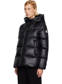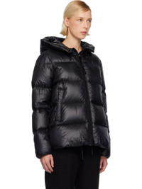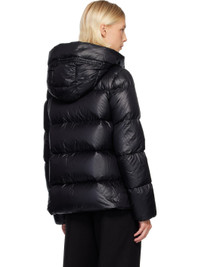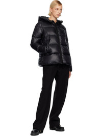 Down-filled and quilted nylon longue saison jacket. · DIST-certified down · Water-repellent · Bungee-style drawstring at hood · Two-way zip closure · Welt pockets at waist · Felted logo patch at sleeve · Elasticized cuffs · Fully lined Supplier color: Black Body: 100% polyamide. Fill: 90% goose down, 10% feather. Lining: 100% polyamide. Made in Moldova 252111F061002