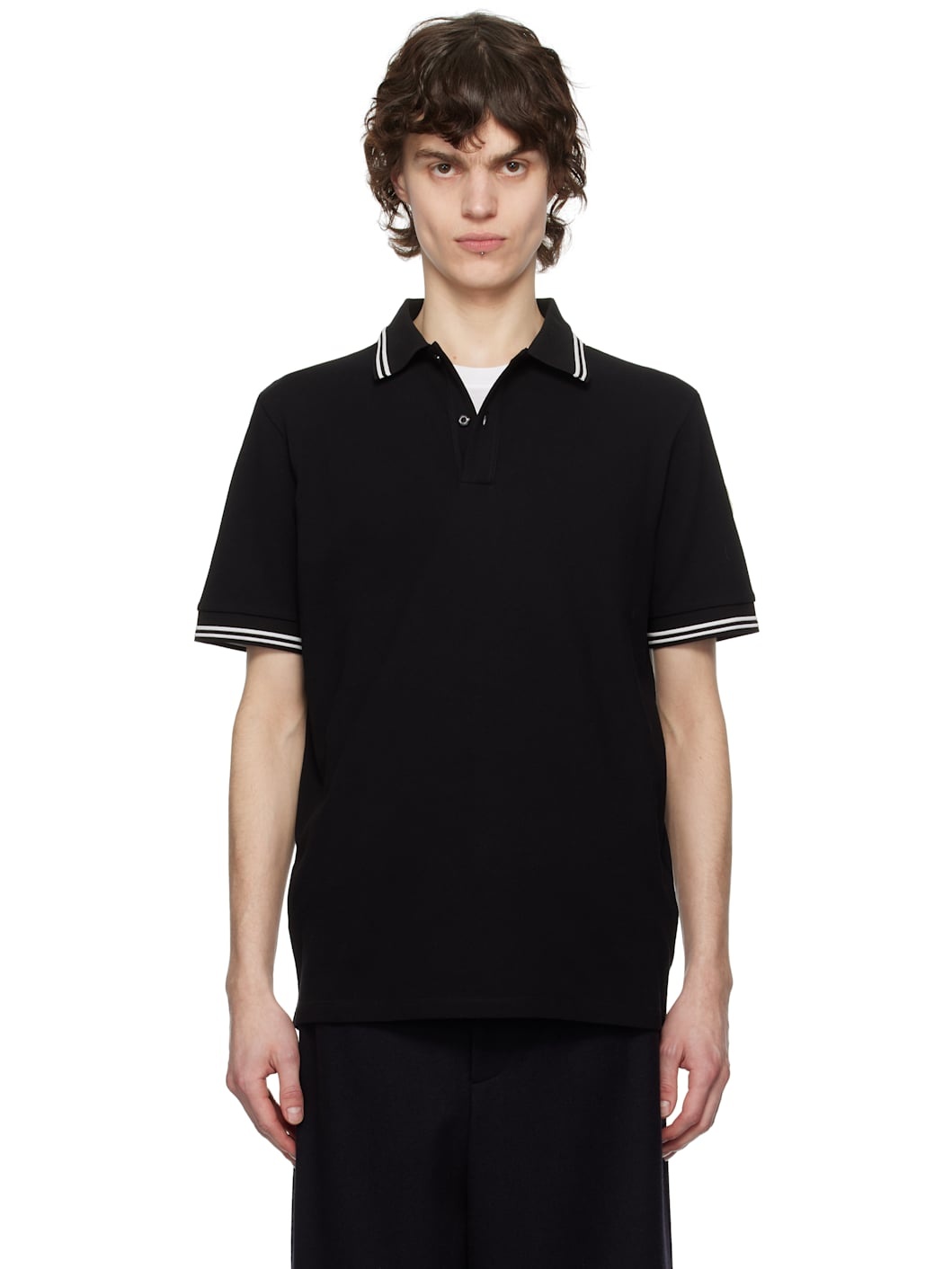 Cotton pique polo. · Striped rib-knit spread collar and cuffs · Two-button placket · Felted logo patch at sleeve · Mother-of-pearl hardware Supplier color: Black 100% cotton. Made in Turkey 251111M212004