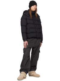 Lightweight and DIST-certified down-filled quilted nylon longue saison jacket. · Bungee-style drawstring at detachable hood · Funnel neck · Two-way zip closure with press-stud placket · Zip pockets · Concealed bungee-style drawstring at hem · Flap pocket and felted logo patch at sleeve · Adjustable press-stud tab at elasticized cuffs · Zip pocket at interior · Full quilted nylon leger lining · Logo-engraved black hardware Supplier color: Black Fill: 90% pure goose down, 10% feather. Body: 100% polyamide. Lining: 100% polyamide. Made in Armenia 242111M178112