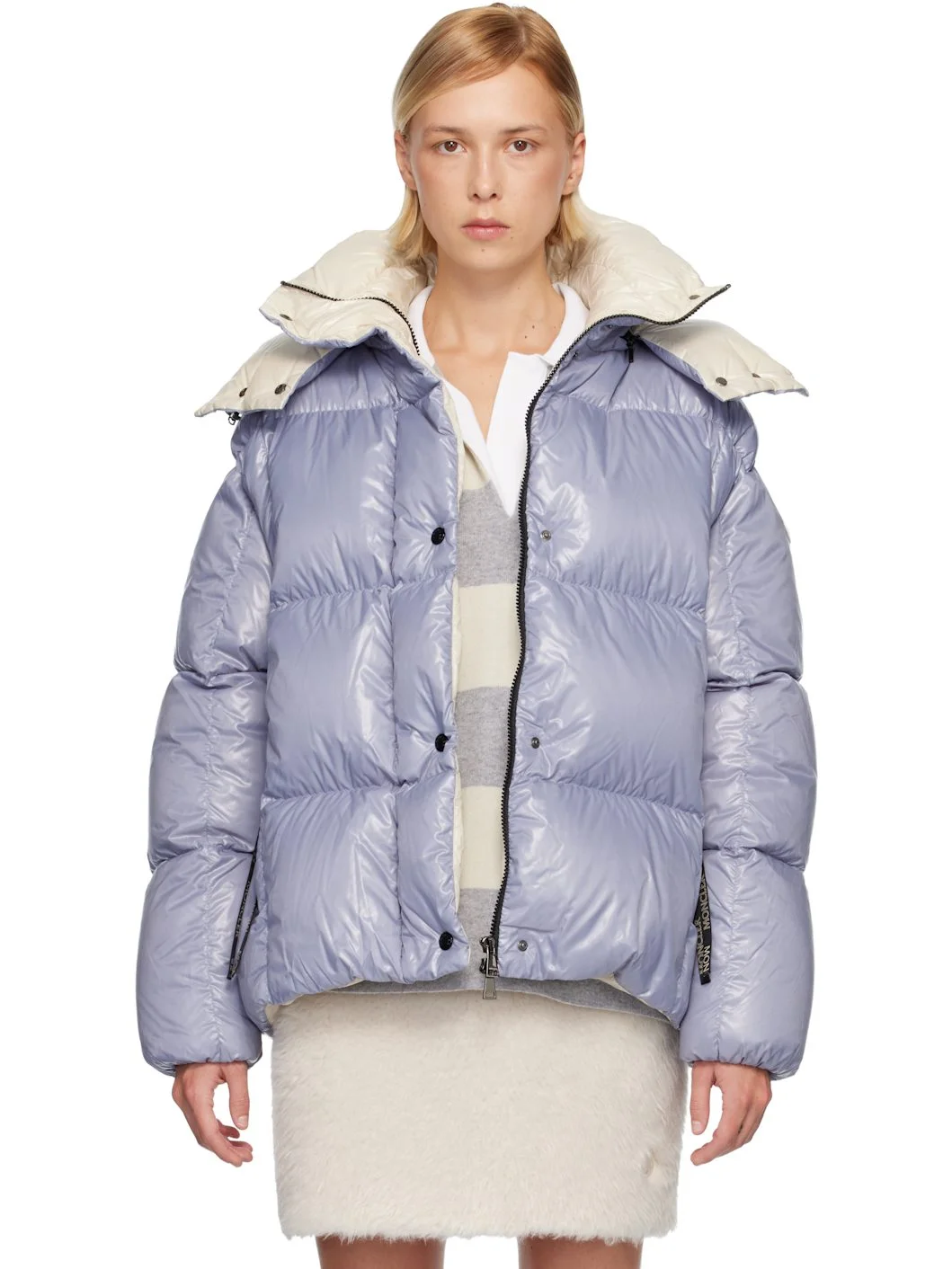 Down-filled and quilted nylon satin jacket. · DIST-certified down · Bungee-style drawstring at detachable hood · Stand collar · Concealed zip closure at press-stud placket · Zip pockets at waist · Felted logo patch at sleeve · Elasticized cuffs · Fully lined Supplier color: Light blue Body: 100% polyamide. Fill: 90% goose down, 10% feather. Lining: 100% polyamide. Made in Moldova 252111F063054