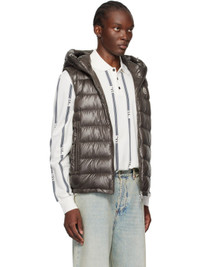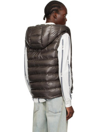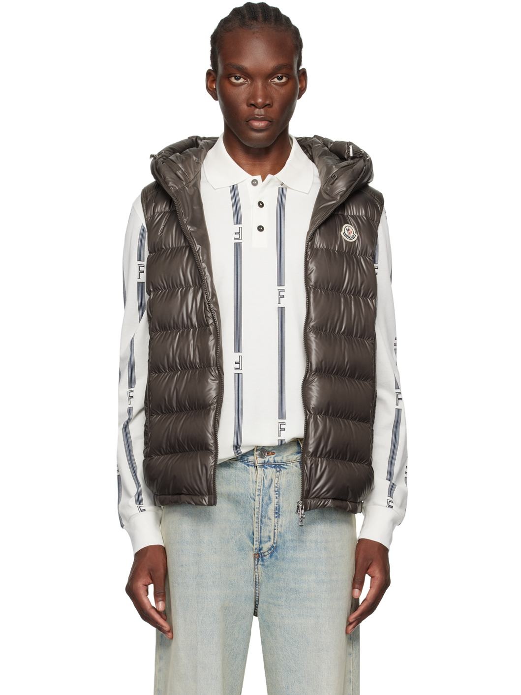 Padded and quilted polyester satin vest. Logo-embroidered grosgrain trim at packable nylon taffeta hood. · Bungee-style drawstring at DIST-certified down-filled hood · Two-way zip closure · Felted logo patch at chest · Zip pockets · Elasticized hem · Zip pocket at interior · Full water-repellent satin lining · Logo-engraved silver-tone hardware Supplier color: Dark brown Fill 1: 90% goose down, 10% goose feather. Body: 100% polyester. Trim: 100% polyamide. Fill 2: 100% polyester. Lining 1: 100% polyester. Lining 2: 100% polyester. Made in Armenia 242111M178075